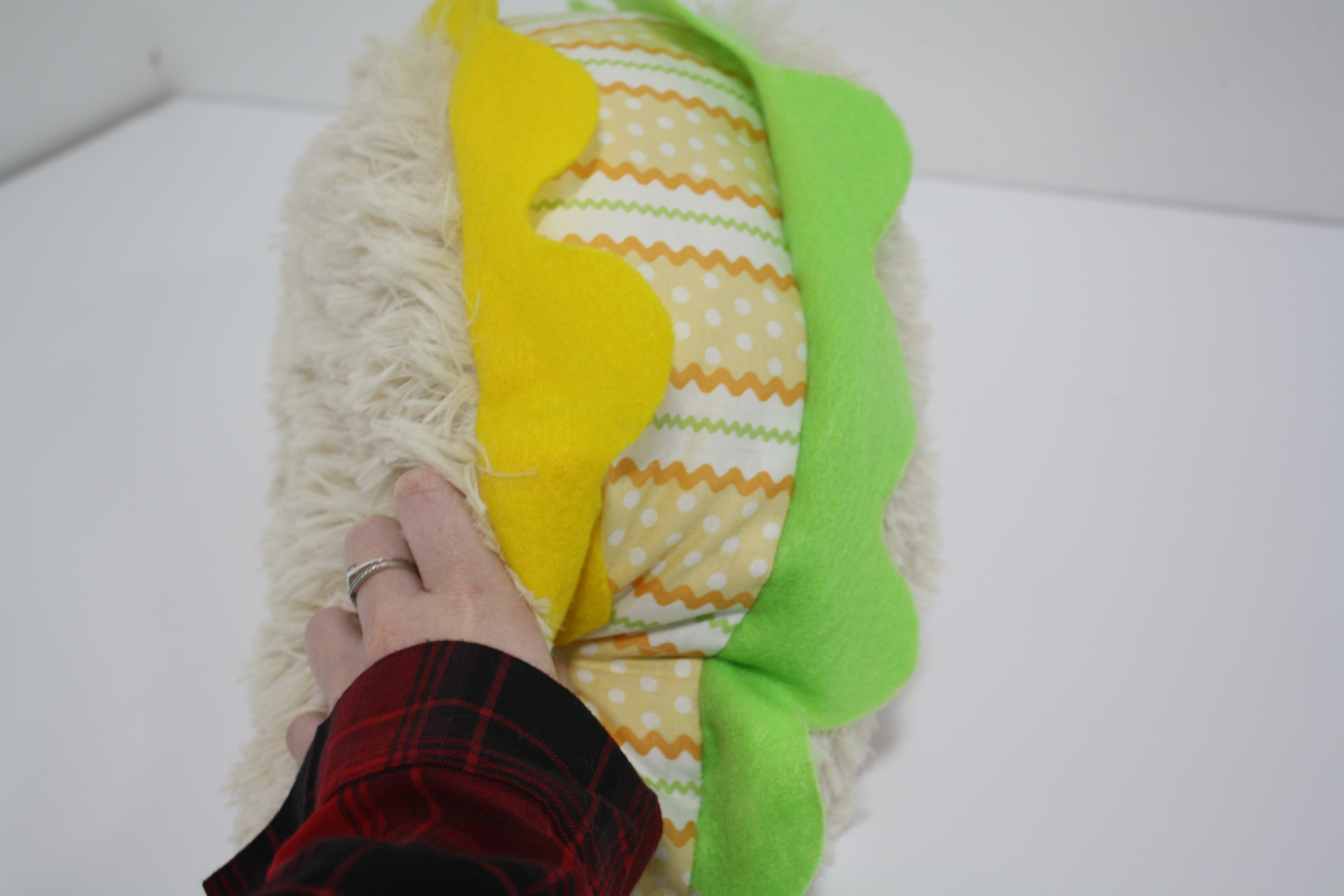A personal project, I just really wanted to use these fabulous, whacky materials for something. So I designed a simple taco pillow pattern and created THE Funky Taco. It came out pretty nice so I made a second one for my sister, her request was- more taco-centric colors but still whacky so... Fluffy Taco!